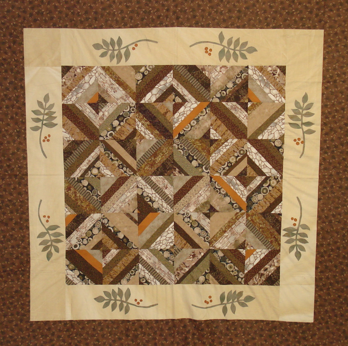 I made this quilt from some of my favorite fabrics.... you know, those textured fabrics that I can't resist buying. I did the foundation method, strips of fabrics different widths, sew, flip and press. The first border was sort of bland until I added the leaves and berries.... nothing fancy but that little touch made me happier. Then I followed up with a 4 inch small print floral. Love it! The quilt measures 48 inches square.
